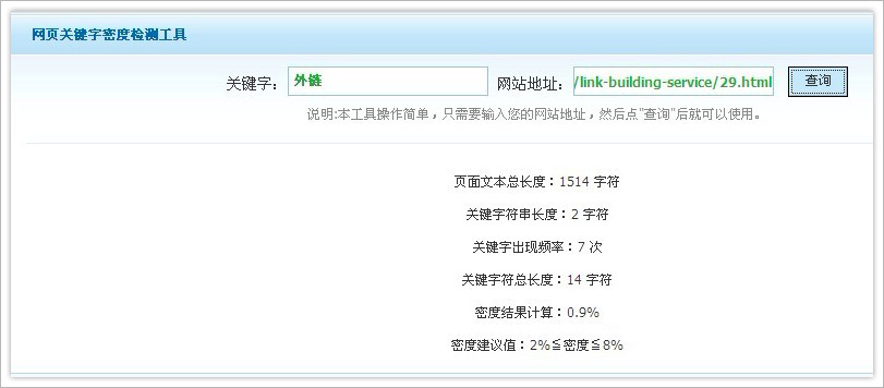 以上介绍的三款工具都将关键词密度建议值标识为:2%—8%之间。这也是目前业内公认的密度建议值。密度过低,不足以突出网页内容与目标关键词的高度相关性;密度过高,则可能被搜索引擎认为有作弊的嫌疑,遭到惩罚。