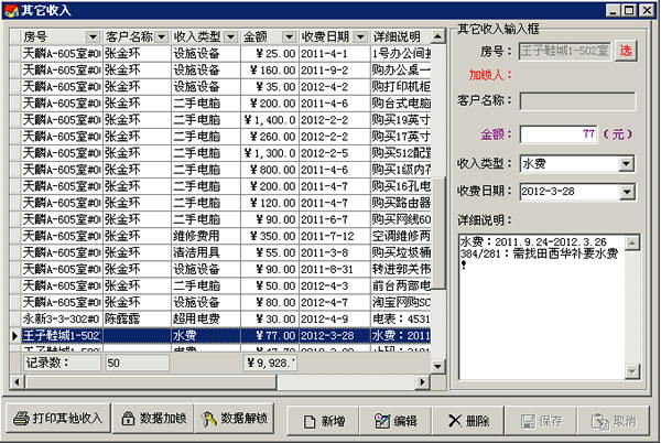 房屋租赁软件,房屋出租软件,租房合同软件,租房自动打单软件,租赁业务管理。适合:小区、公寓、写字楼、厂房、宿舍、商铺等出租。管理人员可随时知道房屋的闲置情况、欠费情况、提前抄表结算报警、电脑自动打印各种单据、日报、月报、收支明细报表、实收收款、未收款、入住退房频率分析等。