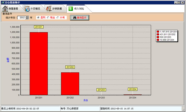 1、能智能统计每个合伙房东,每个月收入多少钱。还有多少未收款,实现利润明确化,透明化,并可通过万心管房助手,个合伙人均可在家里查看每天房屋的闲置情况,收入情况以及经营情况。